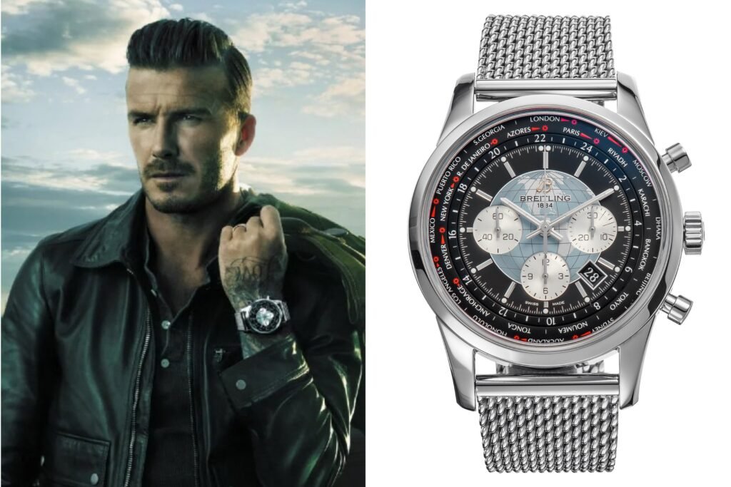 Hasta 2016, y antes de fichar como embajador de Tudor en 2017, Beckham era embajador de Breitling. Uno de los relojes Breitling que le hemos visto llevar es el Transocean Unitime Chronograph. El reloj cuenta con un cronógrafo y un cronómetro mundial que se controlan de forma exclusiva a través de la corona. Esto permite al usuario ver la hora en 24 zonas horarias diferentes a la vez. El Breitling TransOcean Unitime Chronograph está disponible en el mercado secundario por unos 4.500 dólares.