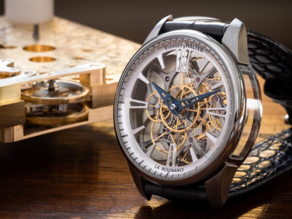 Basado en una complicación muy venerada, La Resonance eleva el concepto de movimiento de un reloj de pulsera con sonería. Completamente construido en torno al calibre, el diseño es un templo de la ingeniería relojera: las placas de zafiro de la caja nos permiten ver ángulos nunca vistos y los puentes completamente esqueletados nos permiten ver el funcionamiento interno. La simetría de los barriletes dobles es visible desde el lado de la esfera, lo que llama la atención dado que están presionados contra el fondo de la caja. Esta pieza increíblemente compleja es un testimonio de la maestría de Vianney Halter en su oficio. Se puede adquirir por una suma no revelada..