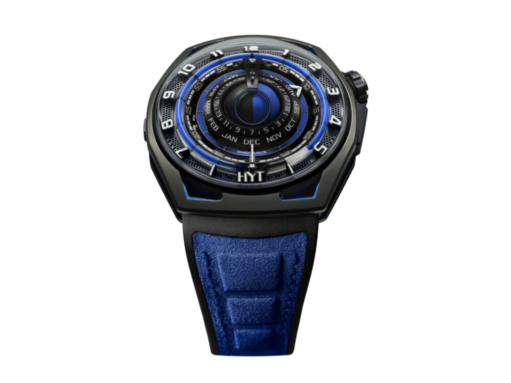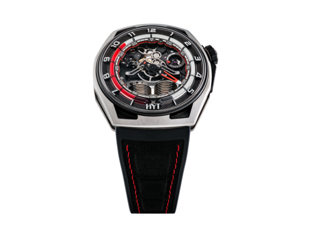 Aunque el resumen anterior suena sencillo, la tecnología utilizada en el cronometraje HYT es increíblemente avanzada en la actualidad. Los líquidos coloreados y transparentes que utiliza HYT contienen sustancias químicas específicas que no pueden mezclarse, para garantizar que siempre haya un punto final claro en el color. Más que un simple elemento de diseño, los relojes HYT incluyen un conjunto de fuelles, cada uno de ellos responsable de uno de los líquidos del tubo horario. A medida que un líquido avanza desde su fuelle, el otro retrocede hacia su fuelle respectivo. Entonces, dos veces al día, el líquido coloreado «rebobina» para designar el comienzo de unas nuevas 12 horas. ¿Impresionante? Sin duda. ¿Impresionante? Bastante, sí. He aquí un par de nuestras iteraciones favoritas de la tecnología HYT.