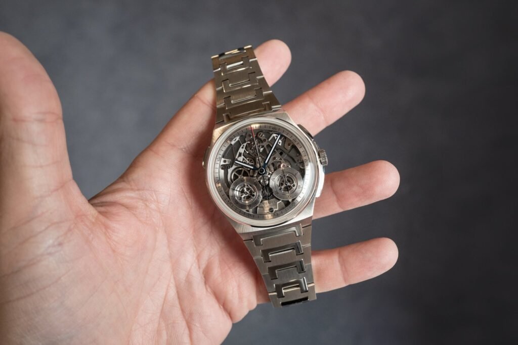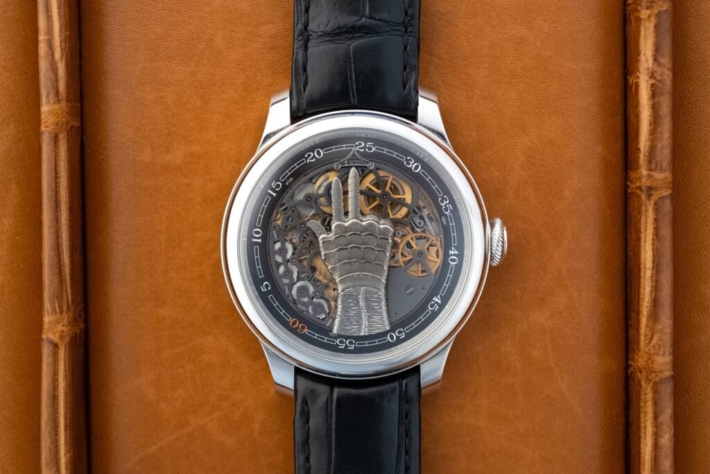 No, este reloj no es un guiño a Thanos, pero es igual de espectacular. Este reloj está lleno de estilo y es probablemente la única aguja horaria que hayas visto nunca. Desde una perspectiva de alta gama, este reloj cumple todos los requisitos: caja de platino, detalles de titanio y oro de 18 quilates en todo el movimiento. Pero lo que realmente llama la atención de este reloj es la aguja. En este reloj, por primera vez, Journe cuenta las horas en los dedos de la manecilla central. La mano se diseñó a partir de la primera prótesis creada por el cirujano francés Ambroise Pare. Con 7 años de trabajo mecánico relojero, Journe ha diseñado los dedos de la mano para que se muevan y así mostrar las horas del día. Por increíble que parezca, el reloj mantiene un grosor de 10,7 mm, idéntico al de otros relojes de Journe que utilizan el mismo movimiento. Con 42 mm de diámetro y 120 horas de reserva de marcha, este raro reloj puede gustar a casi todo el mundo. Como edición limitada, póngase en contacto con F.P. Journe para obtener información sobre precios..