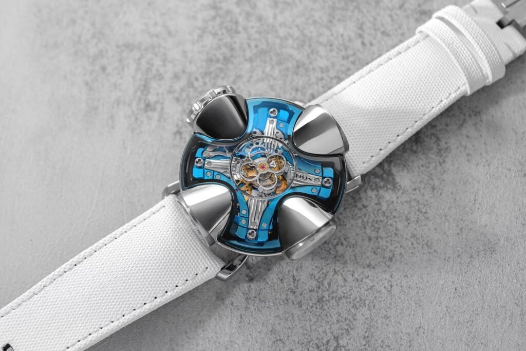 Otro reloj bastante singular de Moritz Grossman: el Backpage. Inusual para los estándares de la industria esta vez, el Backpage es una cosa: volteado. A primera vista, tanto por el lado de la «esfera» como por el de la «relojería», se podría pensar que todo es perfectamente normal para un reloj de alta relojería. Pero no es así. El movimiento está completamente invertido. Los componentes del lado de la esfera están orientados hacia abajo, mientras que el tren de engranajes y los mecanismos de escape son totalmente visibles y están expuestos a nuestro escrutinio. El resto del esqueleto de la esfera es de un impresionante tono azul, que resalta aún más los componentes. Limitado a tan sólo 18 ejemplares, esta llamativa pieza azul se vende por 60.500 dólares..