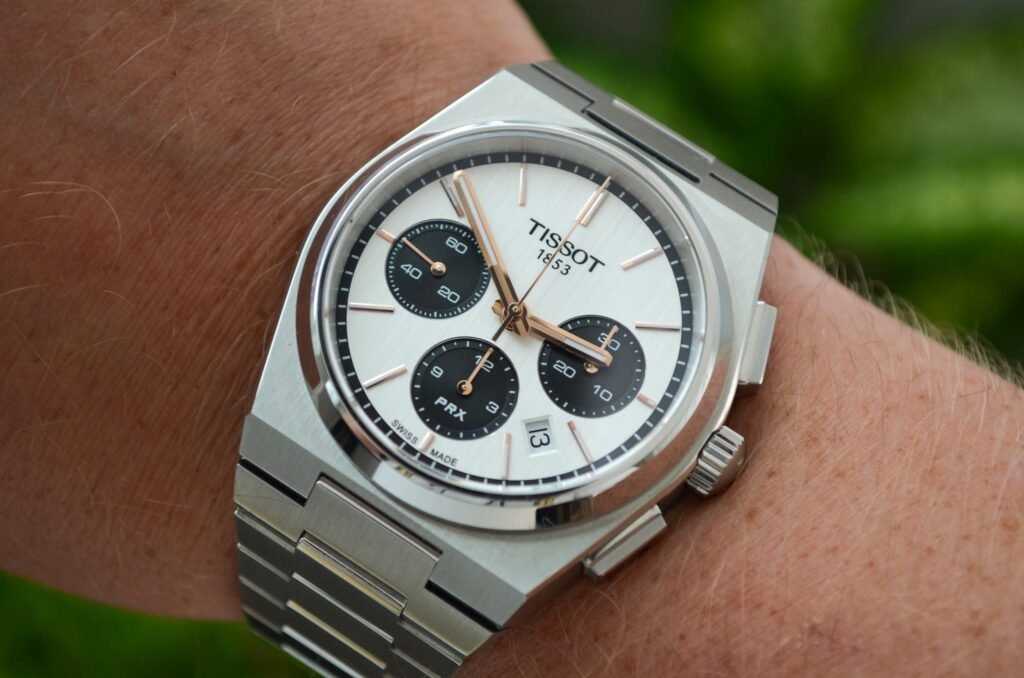 El reloj se ofrece en dos colores de esfera diferentes, una azul con subesferas blancas y otra plateada «panda» con subesferas negras. Aunque somos fans de ambas variantes, la esfera panda es la favorita de Wrist Enthusiast. Tissot optó por una esfera plateada en lugar de la esfera blanca estándar que se suele ver en una esfera panda. Las manecillas y los índices también son de oro rosa, lo que añade un toque de clase al reloj. Por sólo 1.895 dólares, el Tissot PRX Chronograph es un cronógrafo suizo asequible que compite con sus competidores más caros.