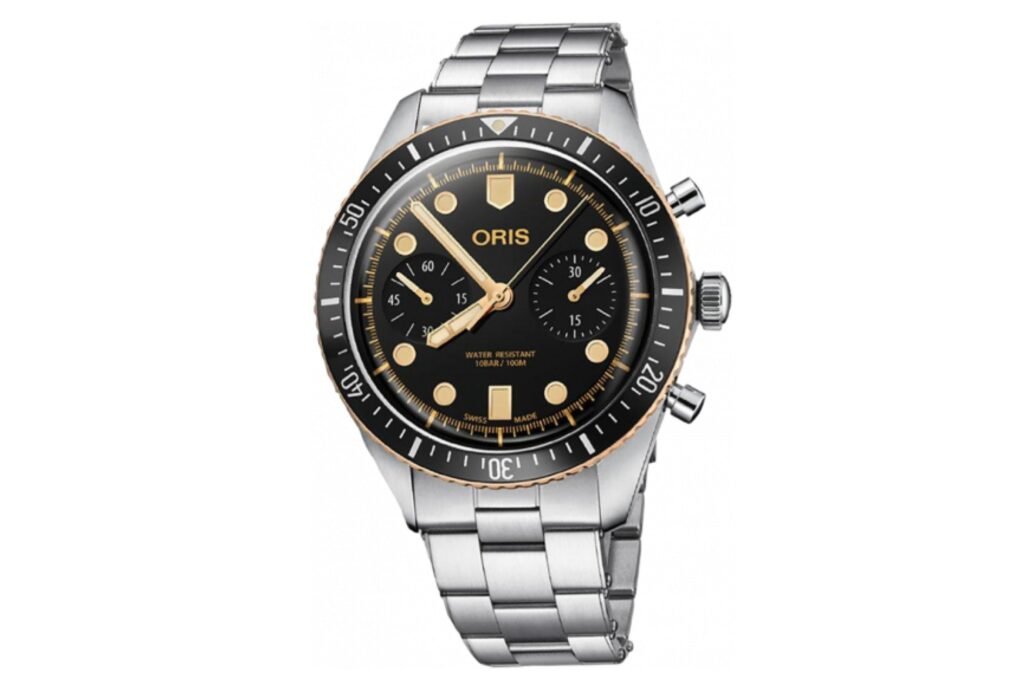 El Oris Divers Sixty-Five Chronograph es otro cronógrafo de inspiración retro de nuestra lista. Básicamente, el reloj es un buceador con un cronógrafo de dos esferas. Aunque sólo es resistente al agua hasta 100 metros, eso debería ser más que suficiente para cualquiera que no sea un submarinista serio.