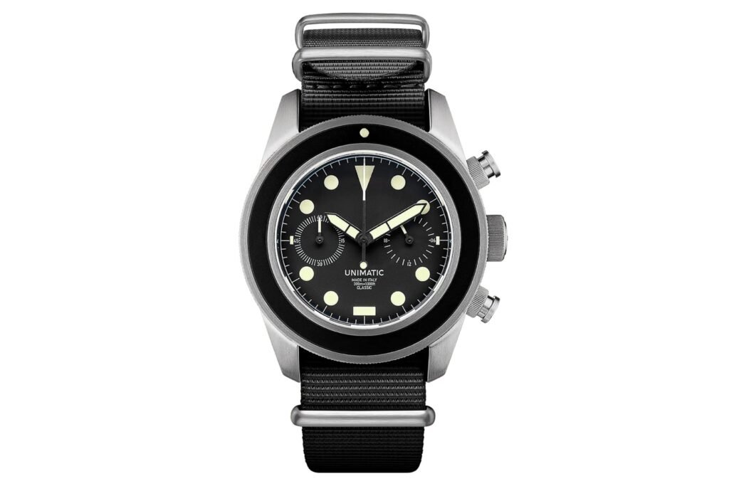 El Unimatic UC3 es el primer cronógrafo de la marca italiana y, sin duda, es muy atractivo. Unimatic siempre ha sido conocida por su enfoque minimalista de los relojes. La marca se identifica fácilmente por sus diseños típicamente monocromáticos y angulares. En el caso del UC3, Unimatic ha añadido dos subesferas a las 3 y las 9 horas para equilibrar el reloj. Las manecillas y los índices son de naturaleza muy militarista y presentan un aspecto más amarillento o «pátina» en comparación con algunos de sus modelos de color blanco puro. Además, Unimatic ha optado por poner el reloj en una correa nato negra para aumentar la influencia militar. Puede adquirir el Unimatic UC3 por 695 dólares estadounidenses..