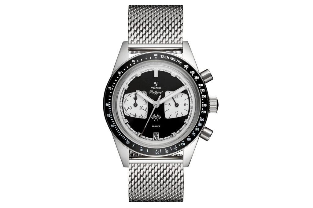 YEMA es una micromarca de la que somos muy fans en Wrist Enthusiast. La marca francesa ofrece relojes de inspiración vintage sin florituras a precios bastante asequibles. Un ejemplo: el YEMA Rallygraff Reverse Panda. Si le gustan los Rolex Daytonas «Paul Newman» de época, pero no soporta su precio (más de 100.000 dólares, según la rareza del modelo), el YEMA Rallygraff es una gran opción. At 399 USD,< YEMA ofrece el aspecto vintage del Newman Daytona por una fracción del precio. El Rallygraph funciona con un calibre híbrido mecánico-cuarzo Seiko VK64, por lo que puede estar seguro de la fiabilidad del movimiento. Es una gran opción en la categoría de menos de 500 USD< cronógrafos.