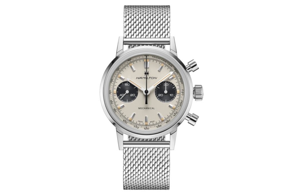 Hamilton Watches tiene una larga historia: fue fundada en 1892 en Lancaster, Pensilvania, y en 1969 se convirtió en fabricante suizo de relojes (Hamilton forma parte ahora del Grupo Swatch). Sin embargo, Hamilton no ha olvidado su herencia americana, y eso es evidente en su bien llamado American Classic Intra-Matic Chronograph H. El reloj es una reproducción de un Hamilton de los años 60 y cuenta con un movimiento cronógrafo mecánico bicompax de cuerda manual. El Intra-Matic original fue lanzado por Hamilton en 1968, justo un año antes de que Hamilton abandonara EE.UU. para trasladarse a Suiza. El reloj cuenta con una atractiva esfera panda (o panda invertida, si lo prefiere) y se presenta con un bonito brazalete de malla. El Intra-Matic Cronógrafo H se vende al asequible 2.145 USD.