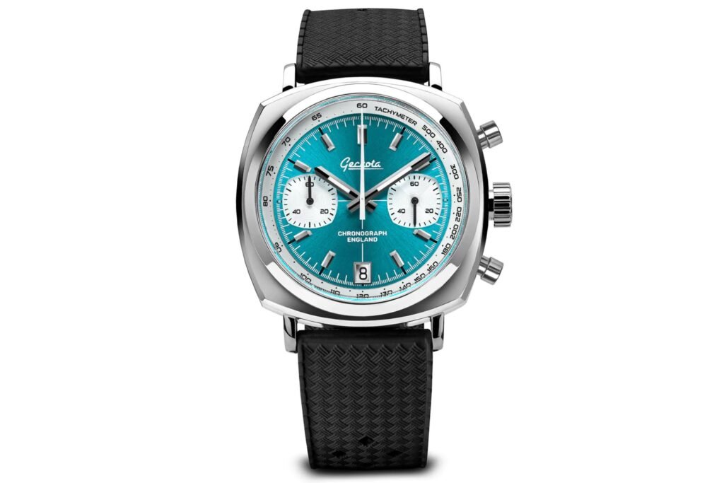 Mientras que la mayoría de las marcas están siguiendo las tendencias y lanzando relojes con esferas azul bebé (er Tiffany Blue) o azul oscuro sunburst, la marca británica Geckota optó por lo que ellos llaman un aqua sunburst en su cronógrafo (entre muchos otros colores de esfera). Geckota es otra marca que ofrece su cronógrafo a un precio asequible (menos de 500 dólares). El diseño retro inspirado en las carreras se combina con colores de esfera vibrantes y modernos. El cronógrafo Chronotimer Aurora se vende por sólo 359 USD, lo que lo convierte en uno de los relojes más asequibles de nuestra lista.