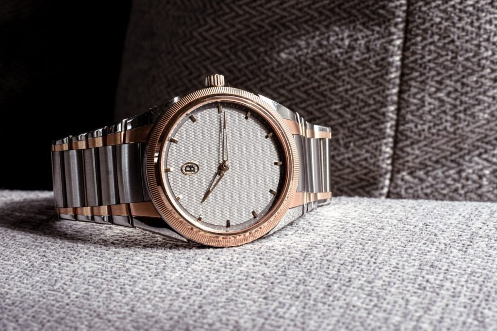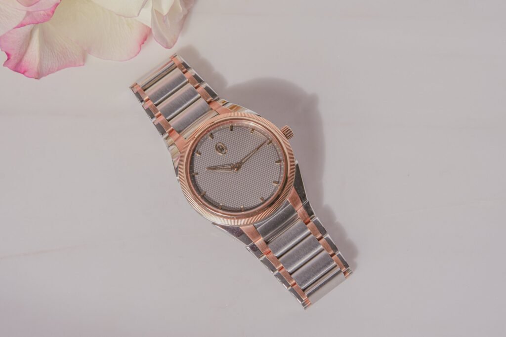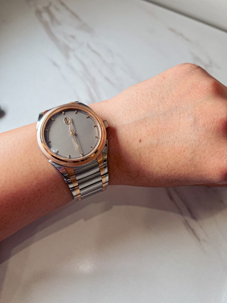El detalle más importante de esta pieza (aparte de su mecánica) es el precioso acabado bicolor en acero y oro rosa de la caja y el brazalete. El detalle en oro rosa de 18 quilates se encuentra en el bisel moleteado, así como en los eslabones verticales del brazalete, que acentúan el estilo cónico. Las agujas, los índices y el logotipo de la esfera y la hebilla también son de oro rosa. En muchos sentidos, el acero, la esfera gris arena y el oro rosa se combinan, pero cada uno destaca a su manera. Es una gran decisión de colorway para esta pieza unisex. Dependiendo de las joyas o el atuendo que llevara, la pieza se adaptaba a estos estilos. Podía hacerlo más femenino cuando lo necesitaba o mantenerlo más neutro en función de mi estado de ánimo.